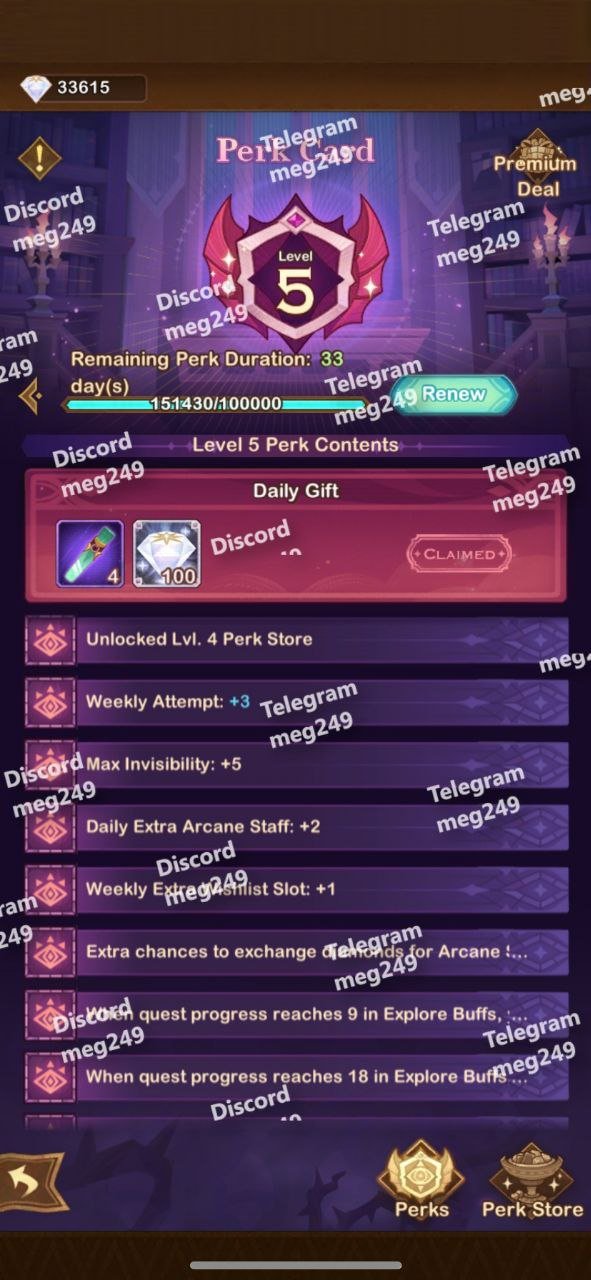 Includes daily rewards, exclusive perks, and bonuses such as extra slots for events and challenges.